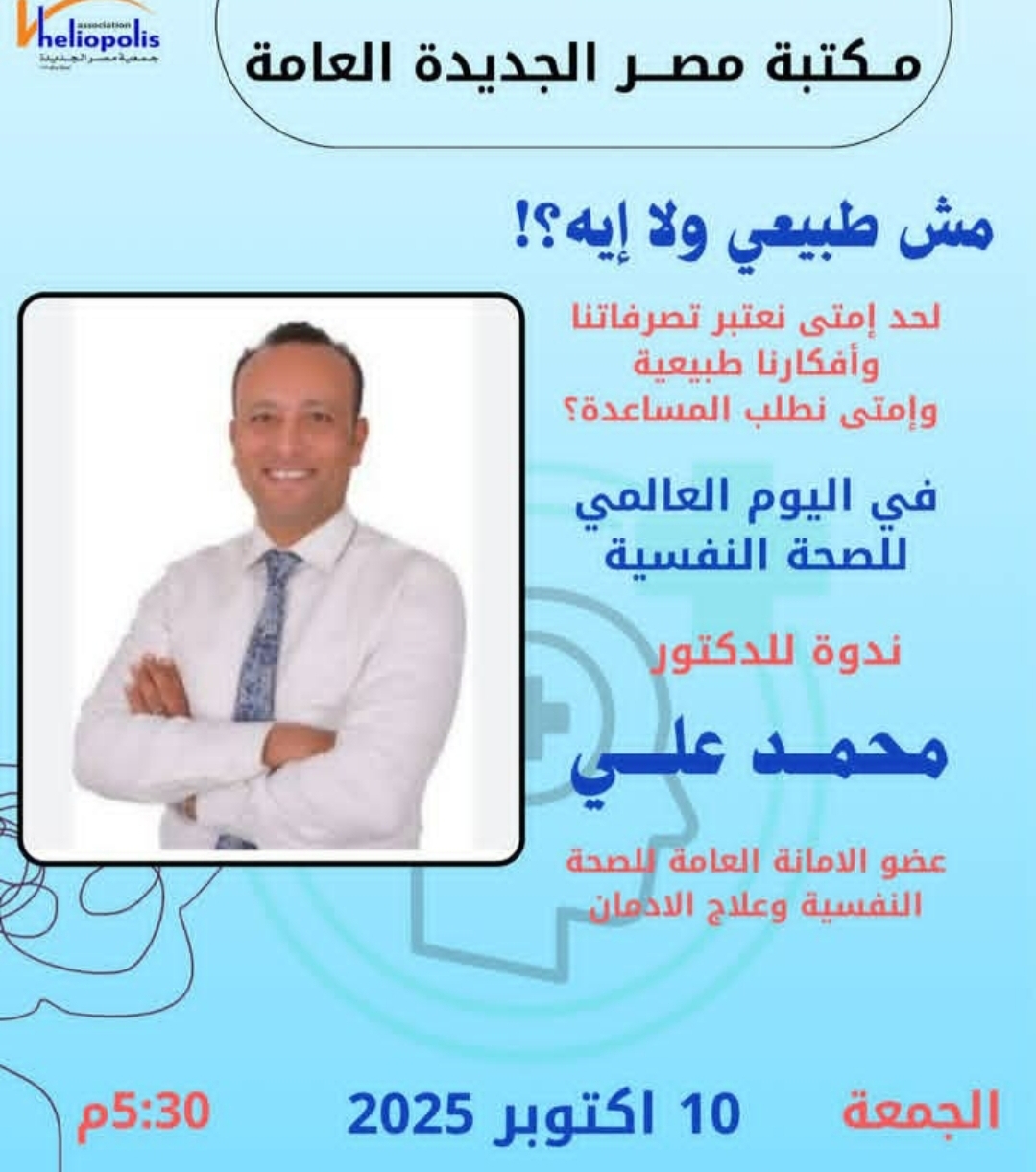 تنظم مكتبة مصر الجديدة العامة فى الساعة الخامسة من مساء يوم الجمعة القادم ندوة علمية بعنوان ، “الصحة النفسية وآثارها على الصحة العامة ” والتى تأتى متزامنة مع اليوم العالمي للصحة النفسية ، والتى تأتى ضمن سلسلة من اللقاءات التي تهم كافة أطياف المجتمع وذلك برعاية الدكتورة سهام الجوهرى ، رئيس مجلس إدارة جمعية مصر الجديدة و اعضاء المجلس