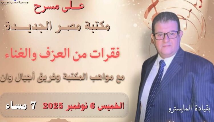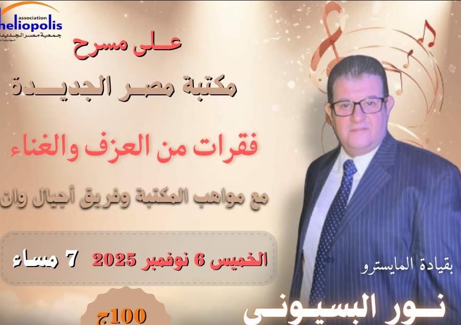 تنظم مكتبة مصر الجديدة العامة فى الساعة السابعة من مساء بعد غد الخميس ، حفل موسيقى لمواهب المكتبة نتاج ورش لتعليم كافة أنواع الآلات الموسيقية وعزف كورال وطبلة وغناء بقيادة الفنان نور البسيوني .