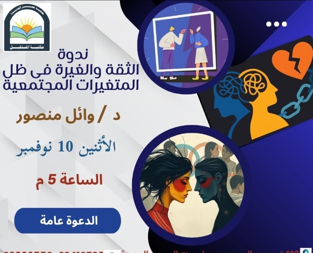 تنظم مكتبة المستقبل ،احدى المنصات الثقافية بجمعية مصر الجديدة ، فى الساعة الخامسة من مساء بعد غد الاثنين ، ندوة بعنوان ” الثقة والغيرة فى ظل المتغيرات المجتمعية ..تحولات فى العلاقات الانسانية”