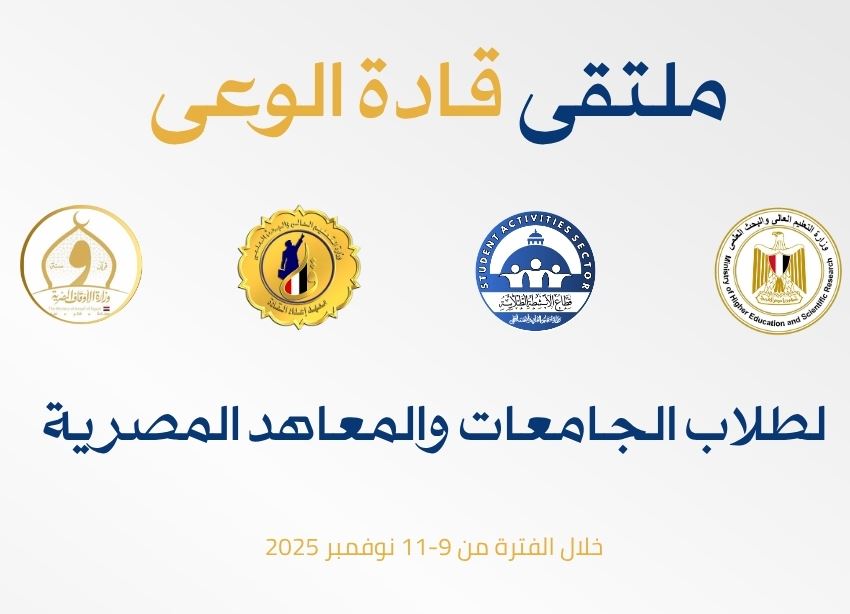 ينظم قطاع الأنشطة الطلابية ومعهد إعداد القادة برنامج “ملتقى قادة الوعي لطلاب الجامعات والمعاهد المصرية” خلال الفترة من ٩ إلى ١١ نوفمبر ٢٠٢٥، بهدف تعزيز الوعي الوطني لدى الشباب الجامعي، وتنمية قدراتهم، وتصحيح المفاهيم الخاطئة، وترسيخ مبادئ الحوار البنّاء والانتماء الوطني.
