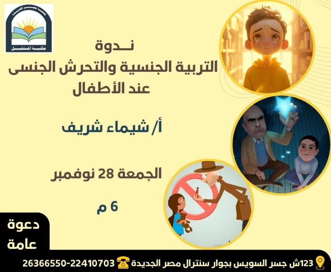 تنظم مكتبة المستقبل احدى المنصات الثقافية بجمعية مصر الجديدة ندوة بعنوان (التربية الجنسية والتحرش الجنسى عند الاطفال) ، وذلك فى السادسة من مساء يوم الجمعة القادم ٢٨ نوفمبر ، تحاضر فيها الاخصائية النفسية شيماء شريف