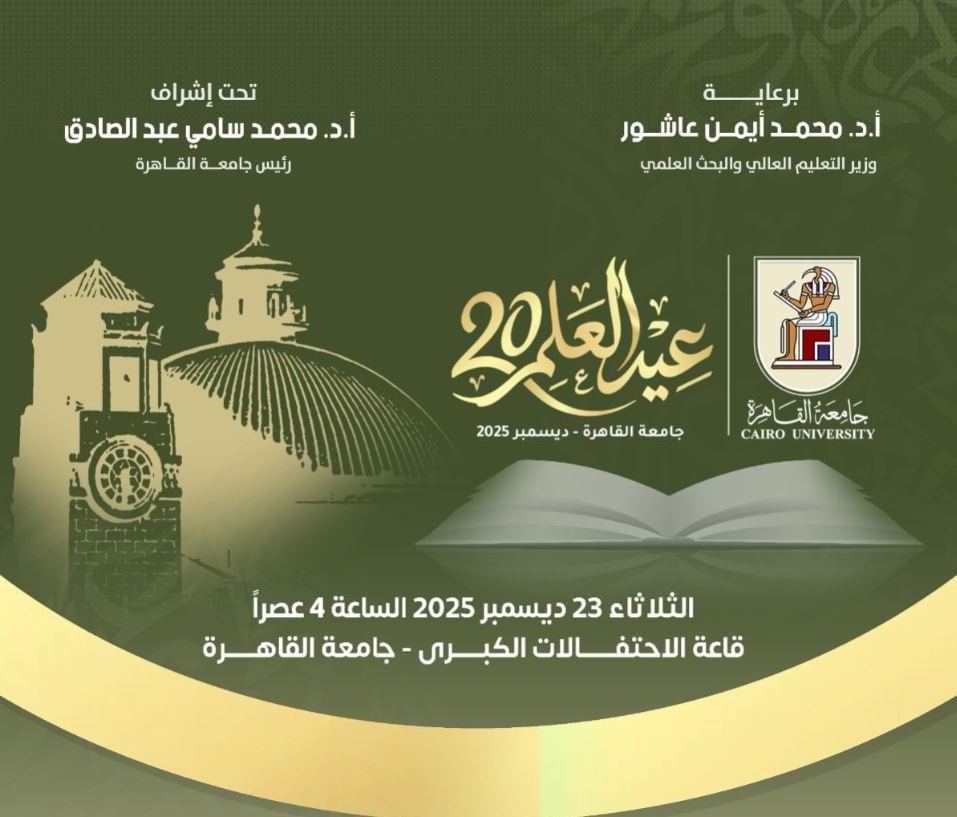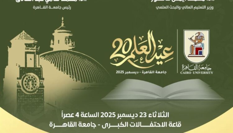 تنظم جامعة القاهرة اليوم الثلاثاء الموافق 23 ديسمبر 2025 احتفالية عيد العلم العشرين، وذلك في تمام الساعة الرابعة عصرًا بقاعة الاحتفالات الكبرى بالجامعة، في مناسبة سنوية رفيعة تمثل محطة مضيئة في مسيرة الجامعة، وتجسد تقديرها المستمر للعلم والعلماء، ودورها التاريخي في دعم التميز الأكاديمي والبحثي.