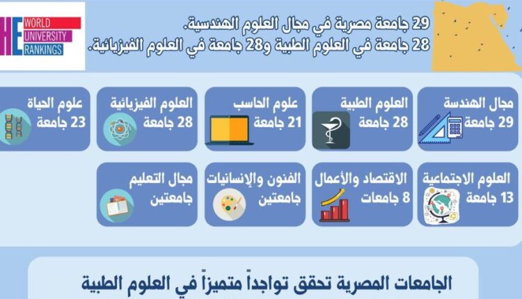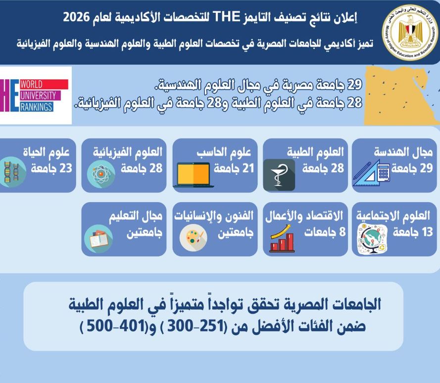 أعلن تصنيف التايمز للتعليم العالي للتخصصات الأكاديمية Times Higher Education World University Rankings by Subject (THE) نتائجه لعام 2026، والتي أبرزت تميز الجامعات المصرية في معظم التخصصات الأكاديمية التي شملها التصنيف، فضلًا عن تحقيق زيادة في أعداد الجامعات المُدرجة في العديد من التخصصات مقارنة بنتائج التصنيف للعام الماضي 2025.