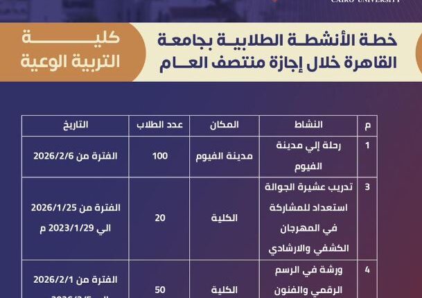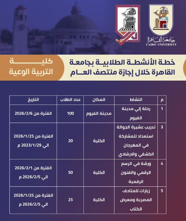 أعلنت جامعة القاهرة عن جداول الأنشطة الطلابية التي تنظمها كليات الجامعة خلال إجازة منتصف العام الدراسي 2025/2026، وذلك في إطار إتاحة فرص متنوعة أمام الطلاب للمشاركة في الأنشطة والفعاليات المختلفة داخل الكليات.