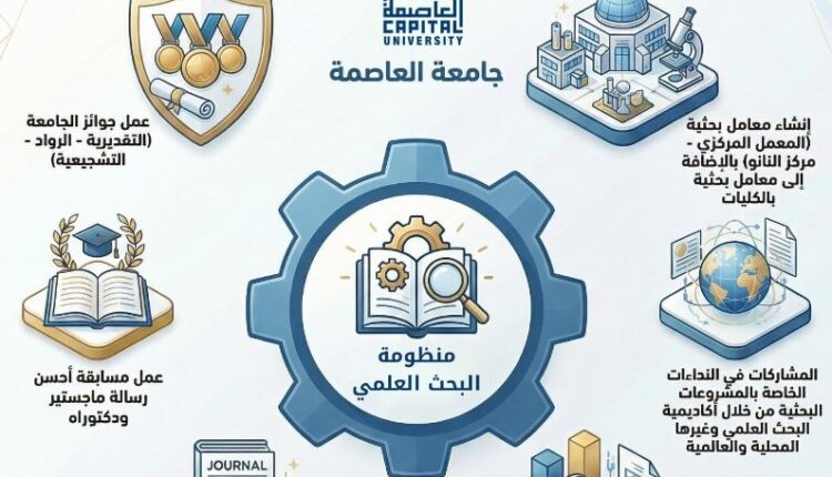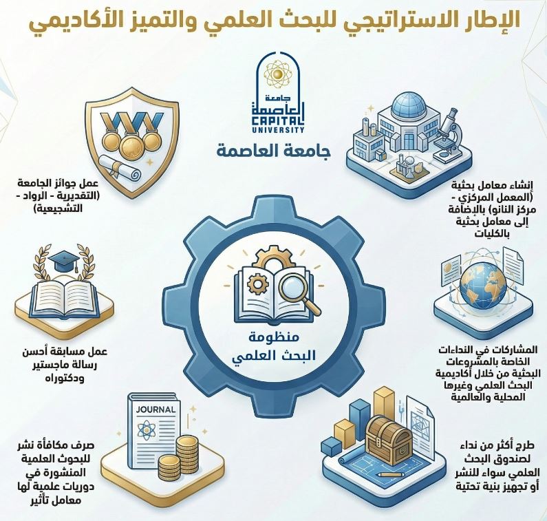 تواصل جامعة العاصمة جهودها المتكاملة للارتقاء بالمنظومة البحثية، من خلال إطلاق عدد من المبادرات والبرامج التي تستهدف تحفيز الباحثين، وتعزيز جودة المخرجات العلمية، وربطها باحتياجات المجتمع وخطط التنمية المستدامة.
