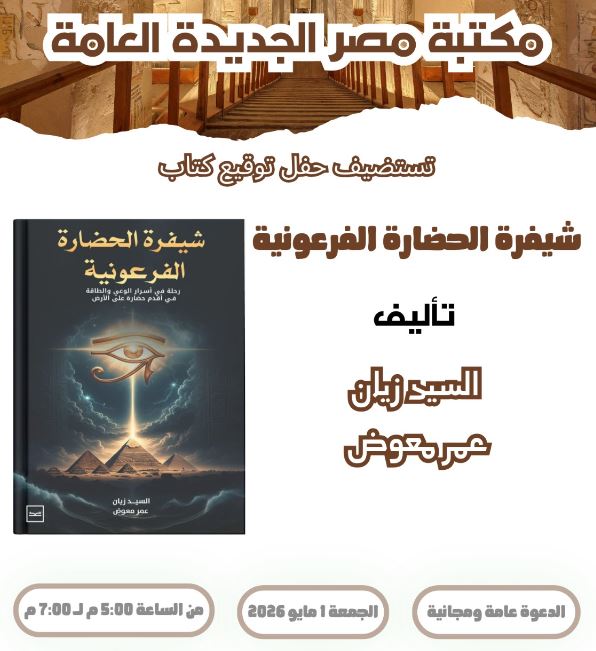 حفل توقيع كتاب “شيفرة الحضارة الفرعونية” بمكتبة مصر الجديدة مساء غد الجمعة
